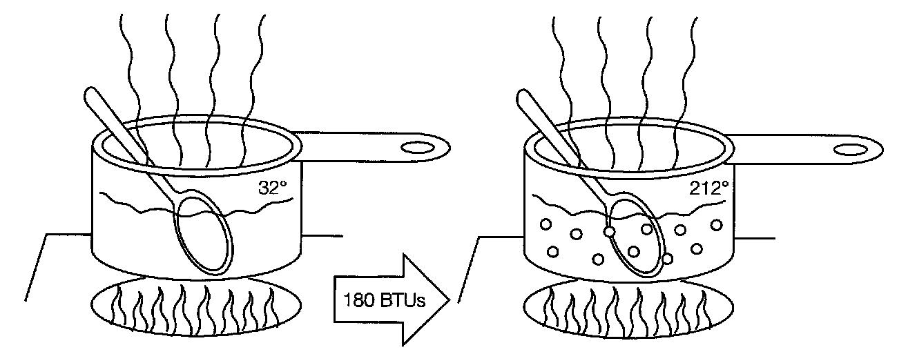 In other words, water acts like a "heat sponge": it soaks up a small amount of heat (180 BTUs per pound) when its temperature rises from 32°F to 212°F and it soaks up a large amount of heat (970 BTUs per pound) when it changes from a liquid to a gas.