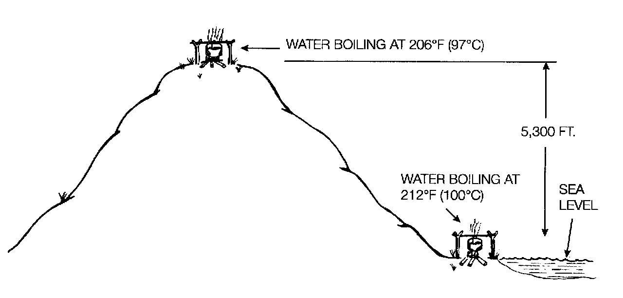At sea level, where the atmospheric pressure is 14.7 psi, the boiling point of water is 212°F (100°C). At any point higher than sea level, the atmospheric pressure is lower and so is the boiling point. In Denver, Colorado (elevation 5,300 feet), water boils at only 206°F (97°C).