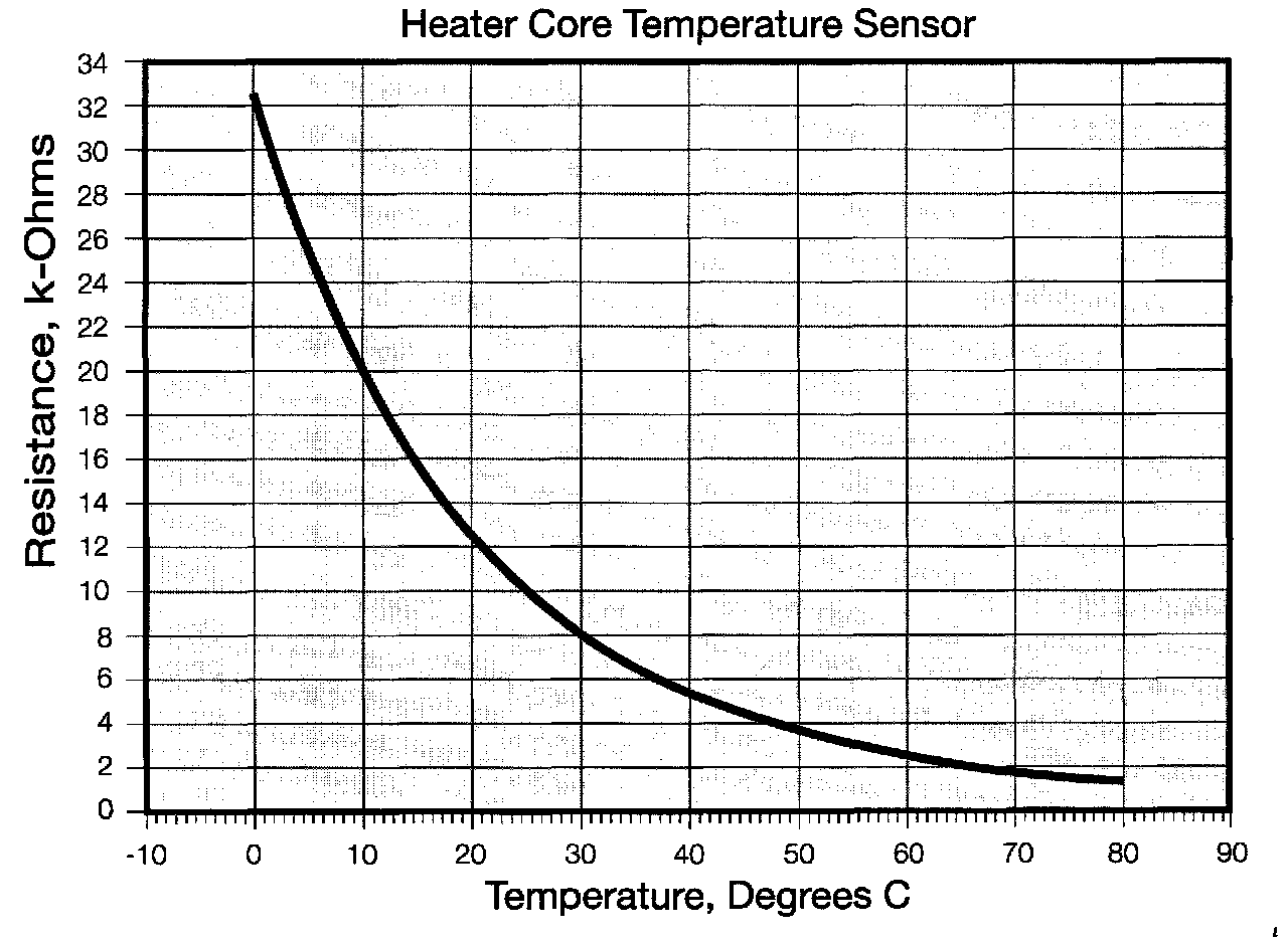 The resistance "curve" (a plot of temperature vs. resistance) for the heater core temperature sensor is shown below.
