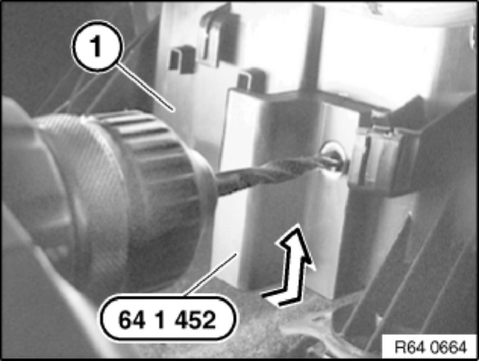 Place drilling template 64 1 452 as illustrated on A/C housing (1) and predrill with 6 mm dia. drill bit.