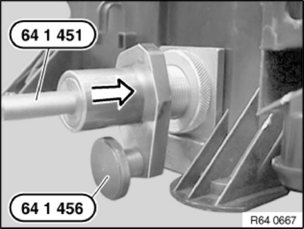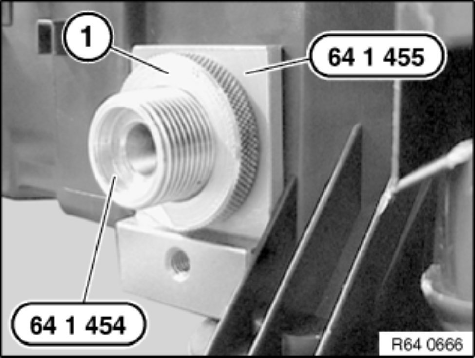 Attach guide for spray lance 64 1 454 as illustrated into hole in A/C housing (1).