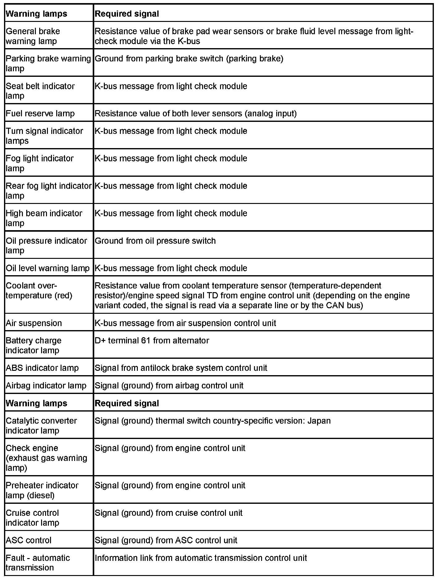 Air suspension: If coded, the warning lamp is switched by a corresponding K-bus telegram from the air suspension control unit (EHC) to the instrument cluster.