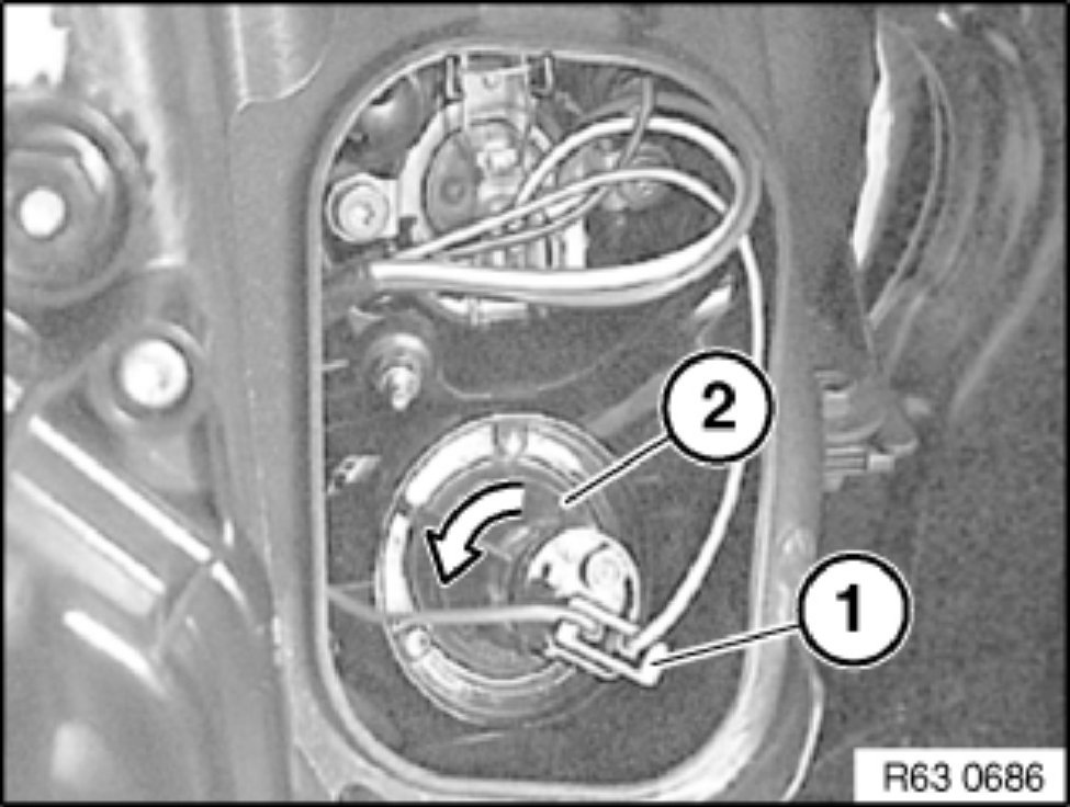 Turn bulb holder (2) through approx. 90 degrees in direction of arrow and remove.