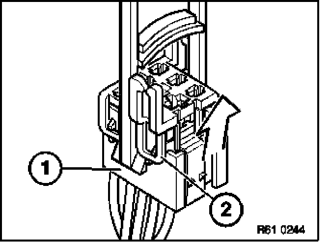 Place special tool 61 1 153 on relay carrier (1) and carefully pull in direction of arrow until retaining lugs (2) on relay carrier are raised.