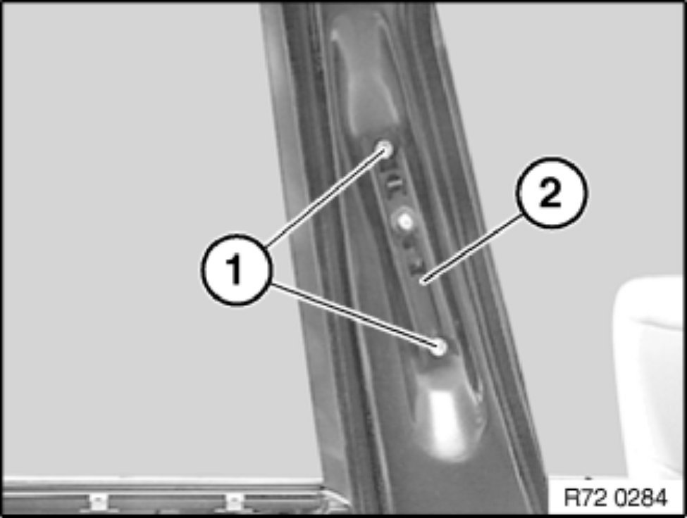 Release seatbelt screw (1) on front seat and feed out seatbelt strap (2).