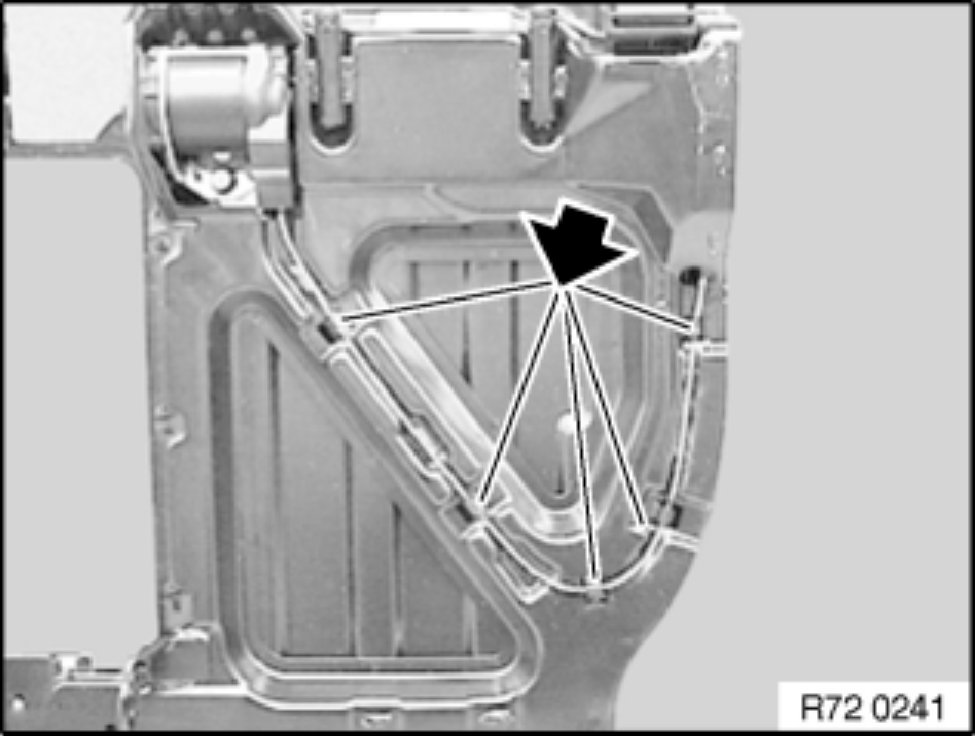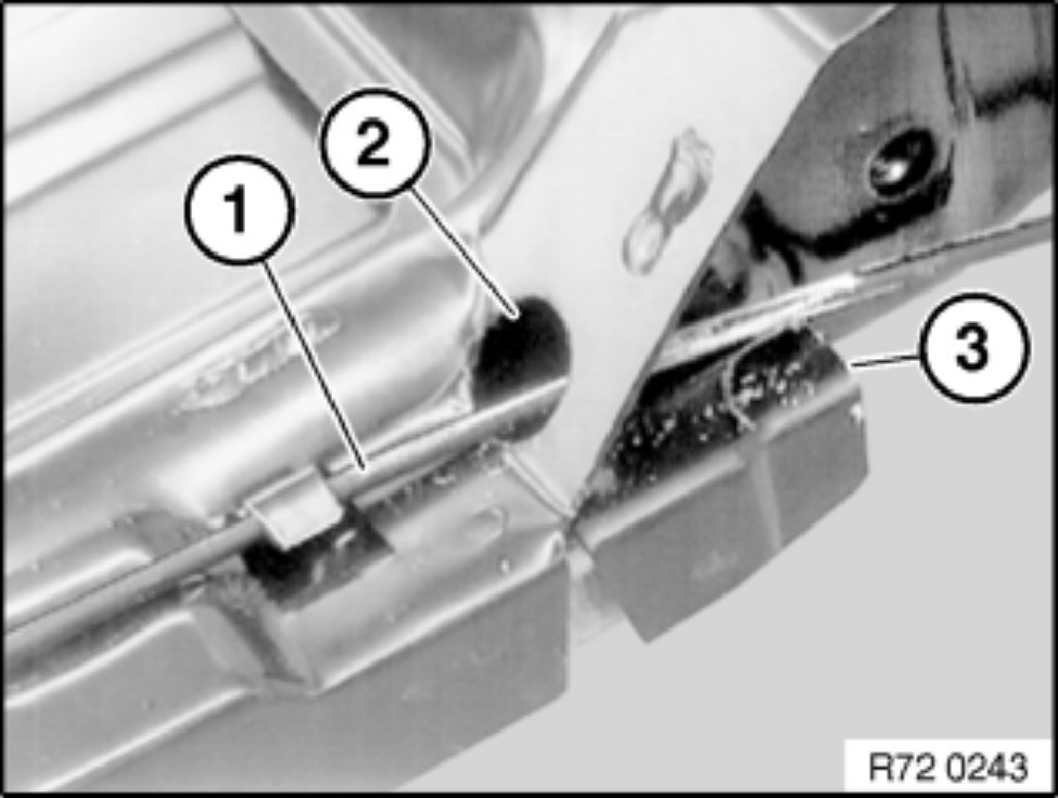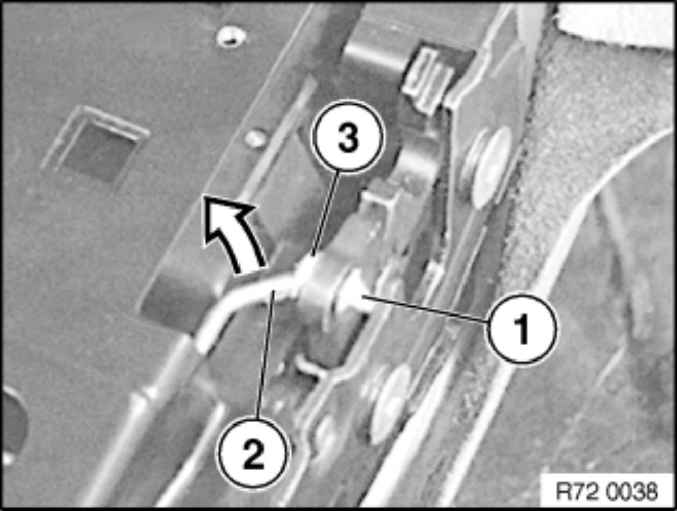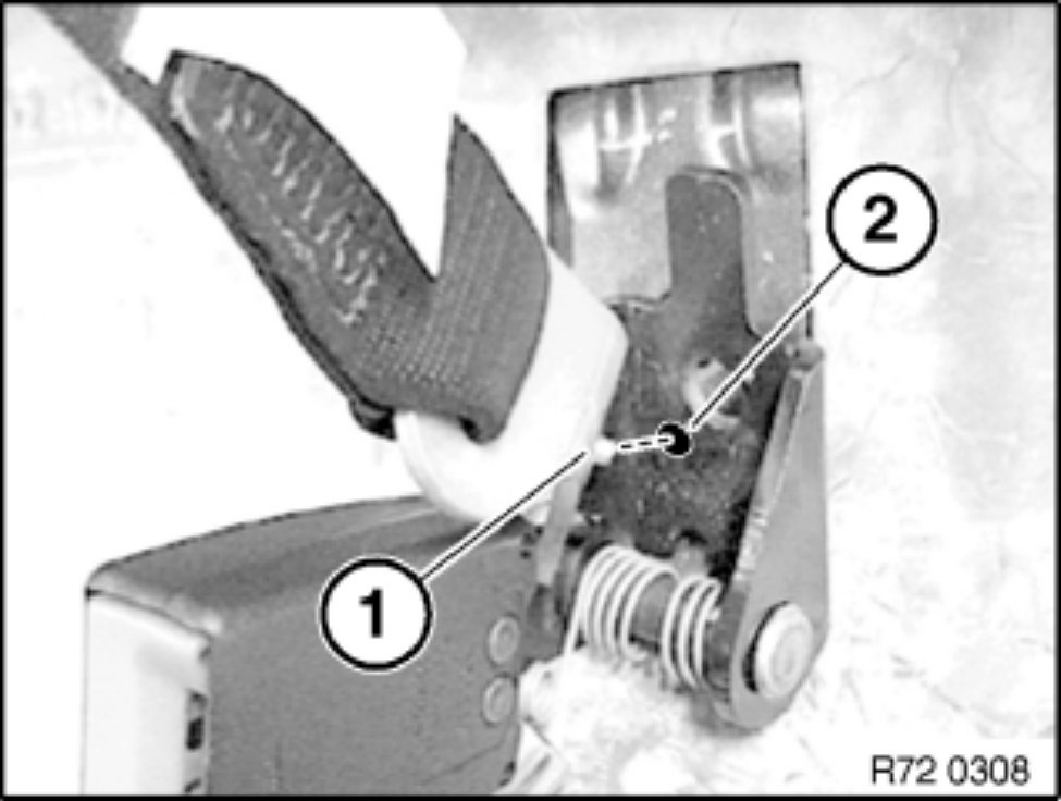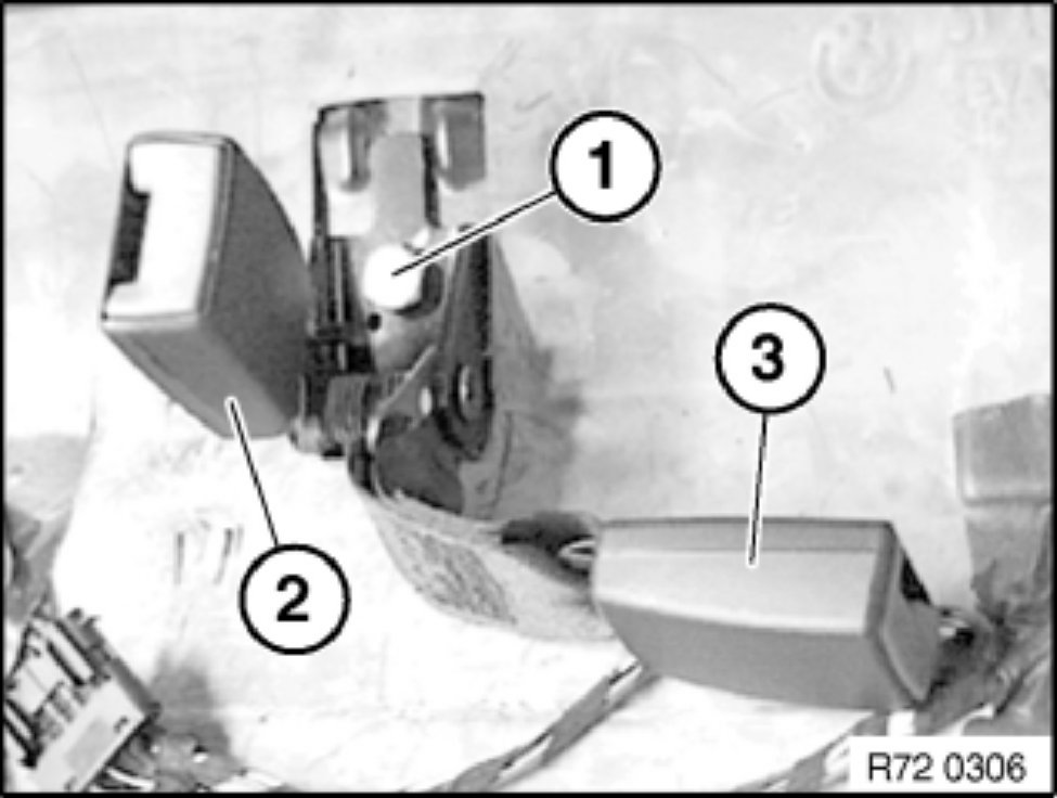 Withdraw seat belt Bowden cable (1) from bore (2) in backrest (3).
