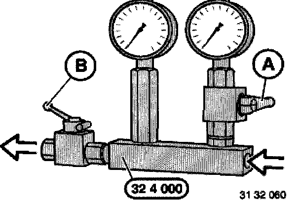 6. Close valve (B) for max. 10 seconds, read off pressure and compare with nominal pump pressure.