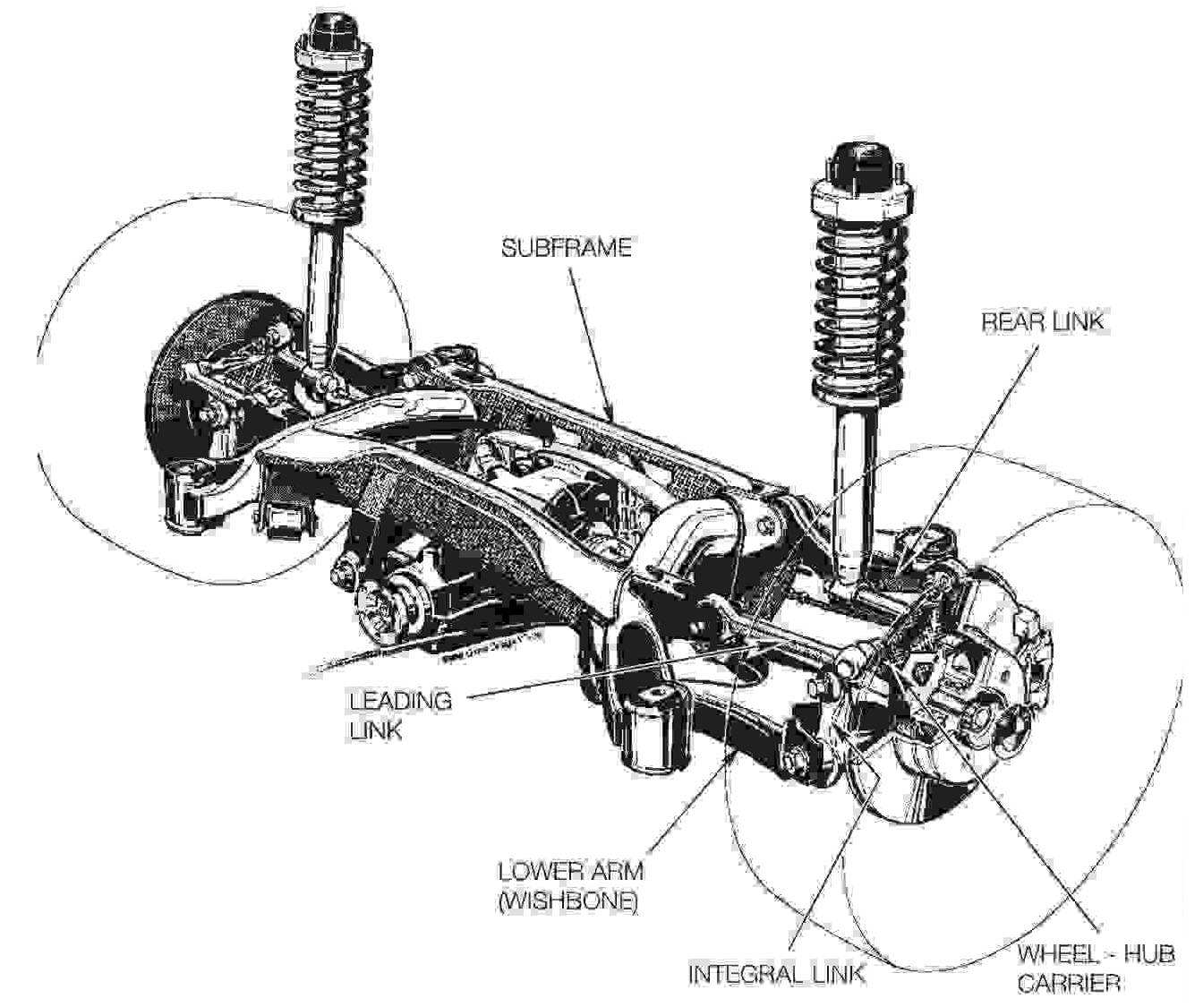 The multiple links connect to the subframe by rubber bushings. The subframe is connected to the body shell by large rubber bushings as well. The system isolates road and wheel vibration very well.