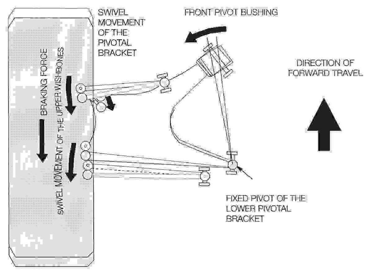The elastokinematic action of the system is provided by calculated movement as a result of driving forces. The movement provides slight changes in the suspension geometry that assists the handling characteristics.