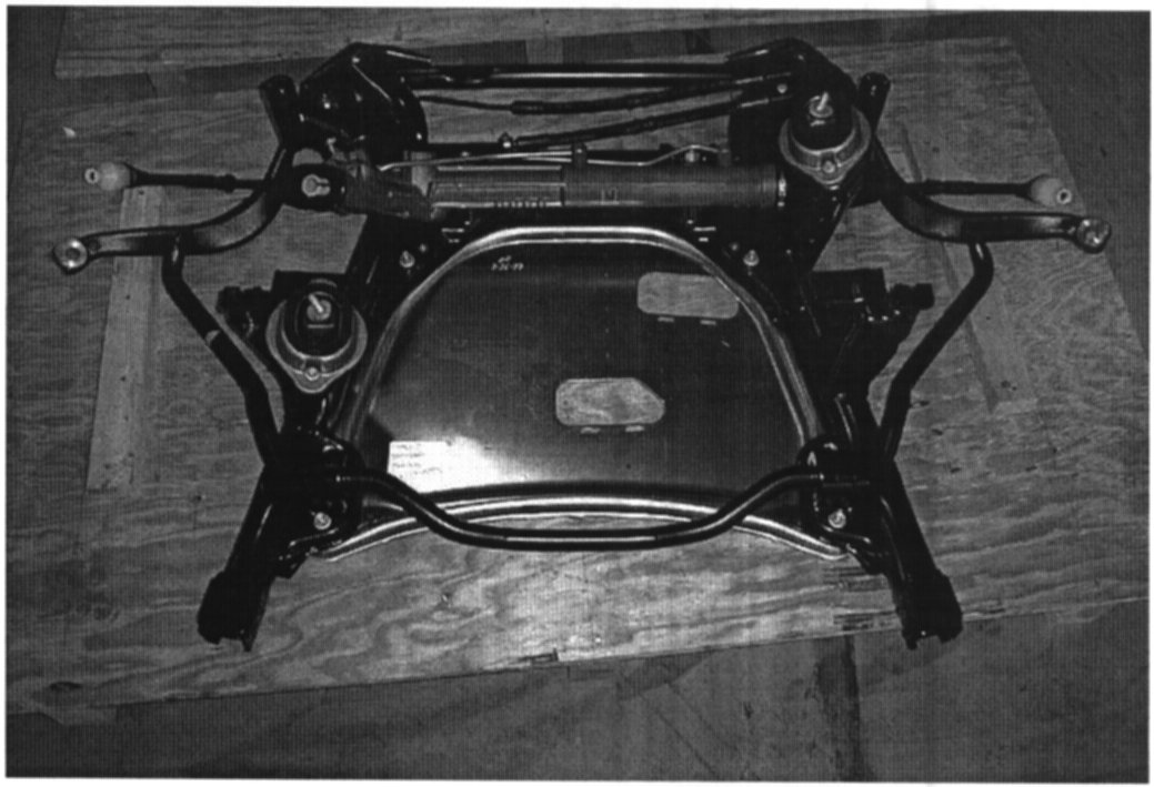 The front suspension design is taken from the E38/E39 double pivot system. The components are larger in size and made from all steel for the expected harder use that the X5 suspension will receive. This includes the sub-frame which is also larger in size and supported by two hydraulic mounts for vibration absorbtion. The front suspension carrier incorporates an aluminum stiffening plate that is bolted to the carrier. It adds to the front axle kinematics by reducing flex in the front suspension. It also provides protection for the oil pan and front end components when off-road and improves the Cd by providing a smooth surface for air flow under the vehicle.