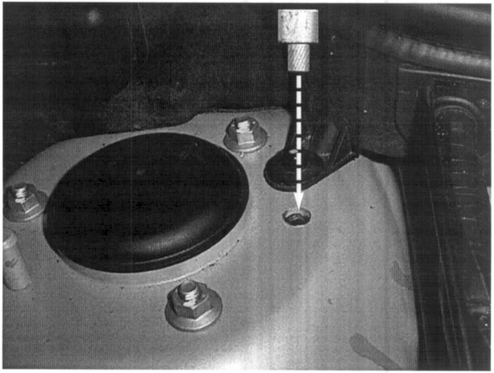 The locating pin at the strut mount is pressed in place and must be pried out for removal in order to make any camber corrections.