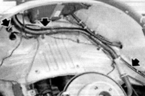 Release pipe following its progression (arrows) and press air spring strut into appropriate position in order to facilitate access to pipe connection.