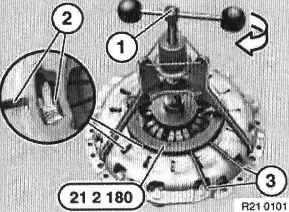 Screw in spindle (1) until adjustment ring of SAC clutch (2) can be turned with special tool 21 2 180 at handles (3).