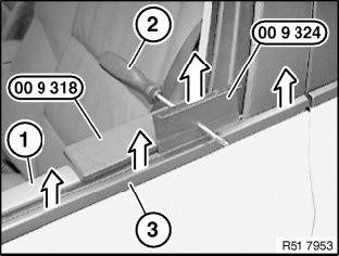 Guide special tools 00 9 324 and 00 9 318 towards front/rear and lever out window cavity cover strip (3) in the process.