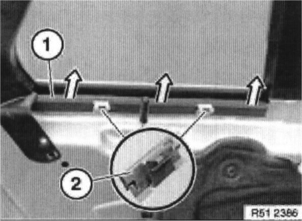 First, carefully position door window (1) with special tool 51 3 221 at bottom, align at sides and install catches (2) in mounts (3).