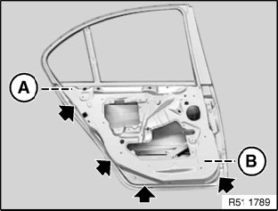 NOTE: In area A ... B, seal on door is stuck on with profile rubber adhesive (sourcing reference: BMW Service).