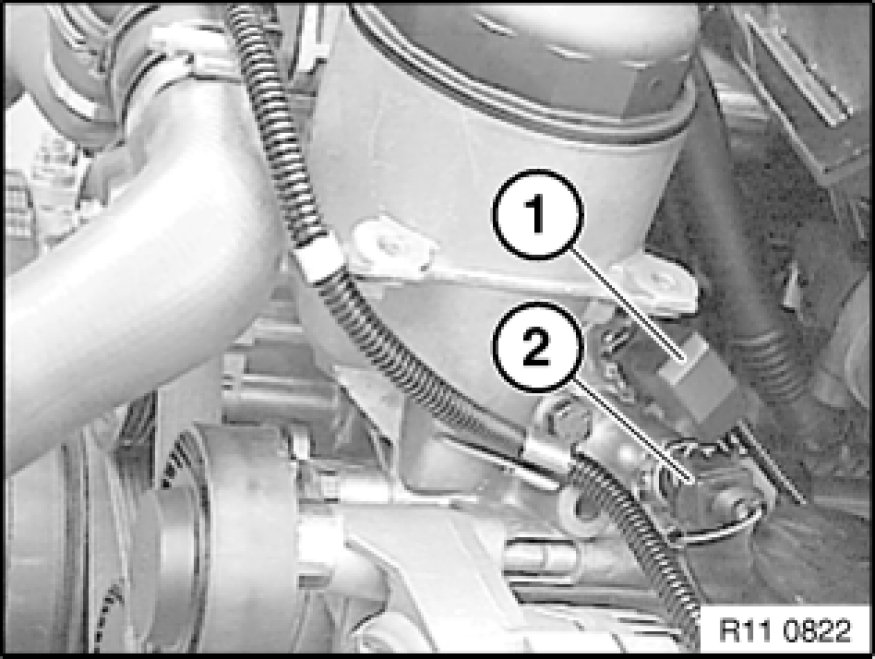 Unclip fuel lines and cable of oil level sensor out of holder (1) on oil dipstick guide tube.