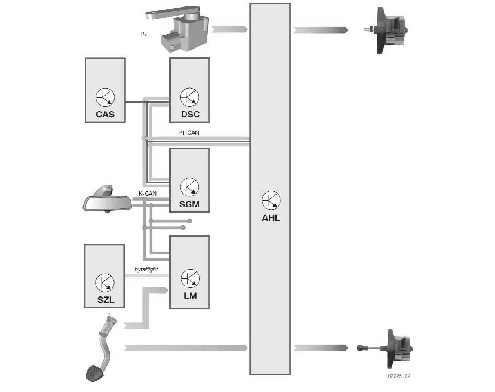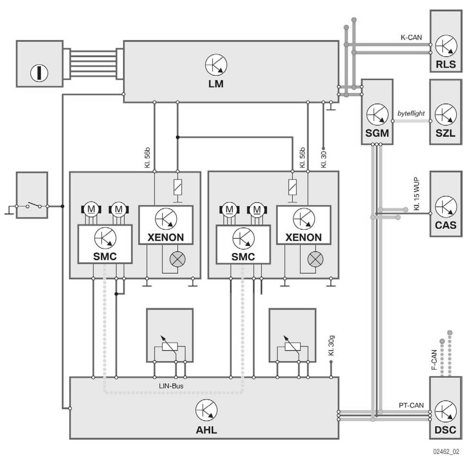 AHL Control UnitThe AHL control unit is the master control unit for vertical and horizontal adjustment of the bi-xenon headlights. The stepper motor controllers actuate the stepper motors of the bi xenon headlights. The AHL control unit is installed on the carrier plate behind the glove compartment.