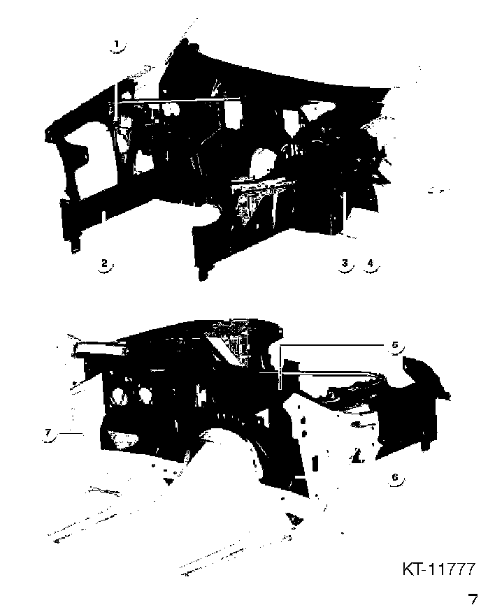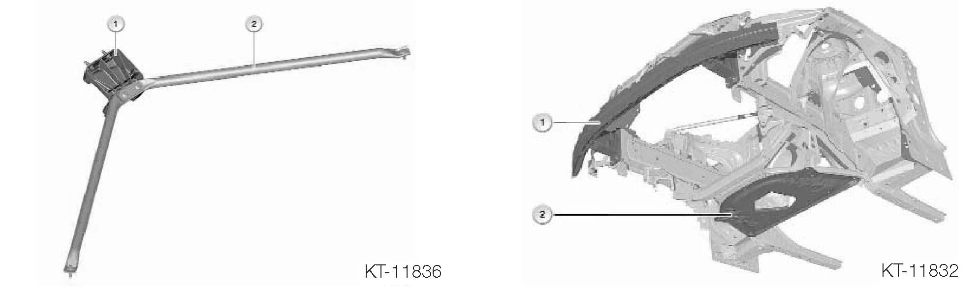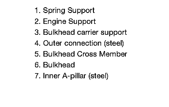 In addition to the underhood strut tower V- struts (2 lower left), the bumper carrier (1 lower right) and thrust panel (2 lower right) provide additional reinforcement and structural rigidity.