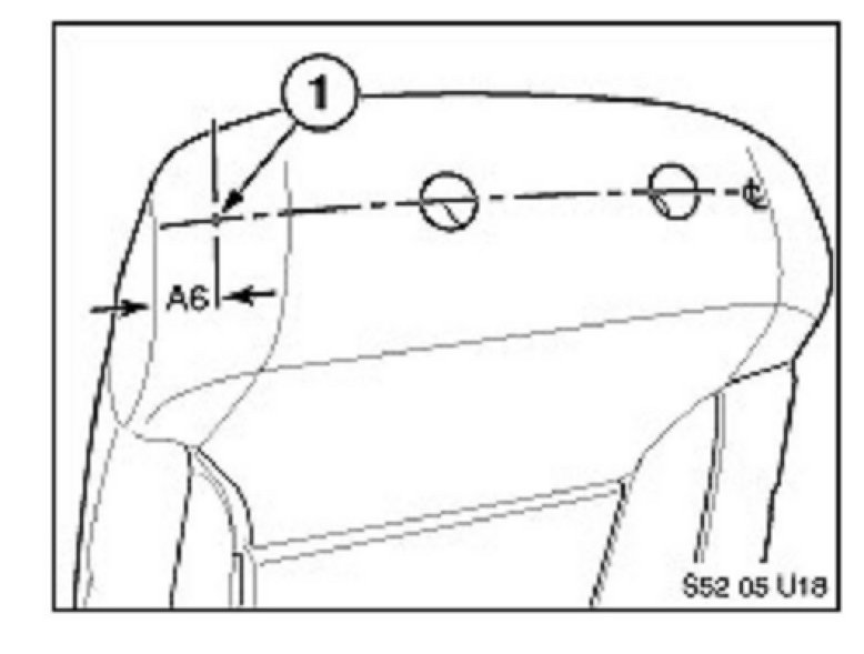 1. Fold door side backrest cover forwards and mark front foam pad (1) at the center of the head restraint holes and at a distance equal to dimension A6 from the edge.