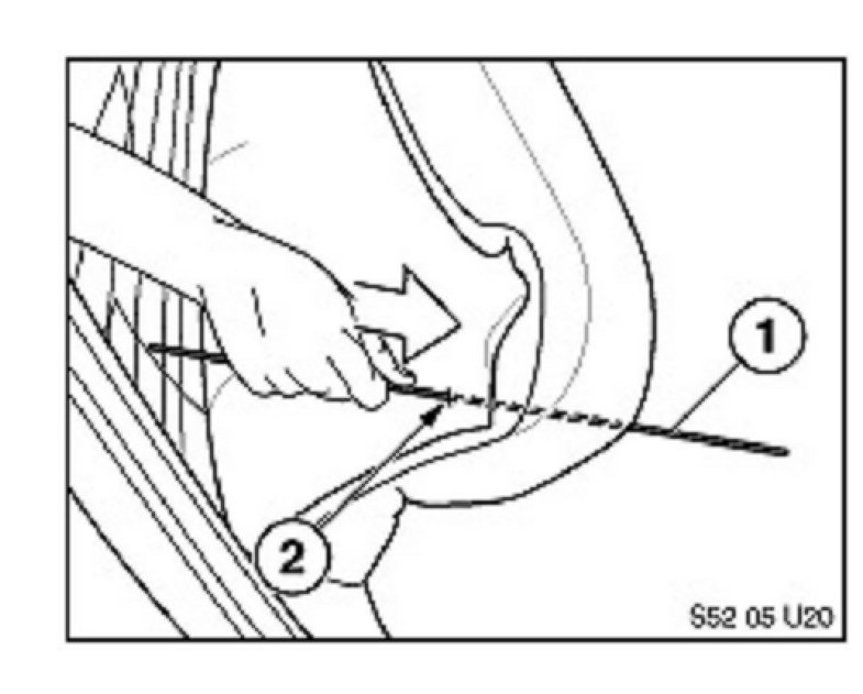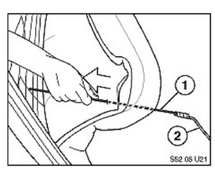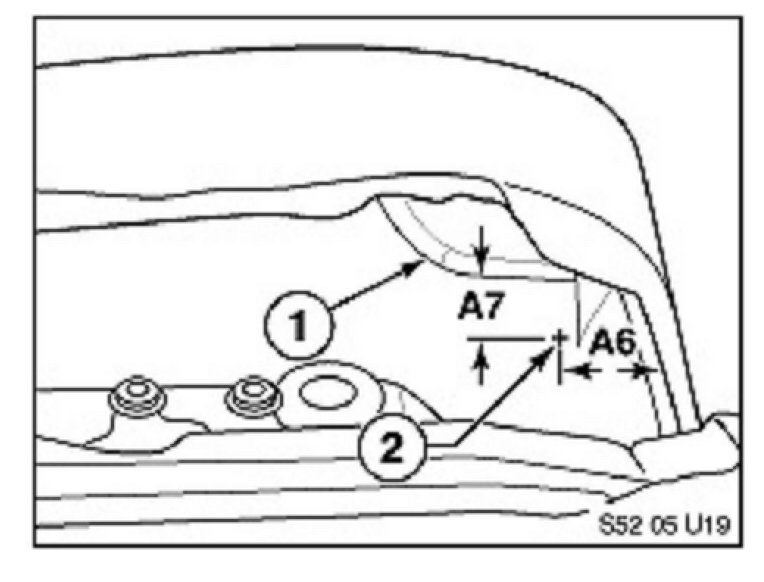 2. Mark (2) the rear side of the foam pad at a distance equal to dimension A7 from the edge of the lower molding contour (1) on the back of the foam pad and mark (2) at a distance equal to dimension A6 from the door side edge.