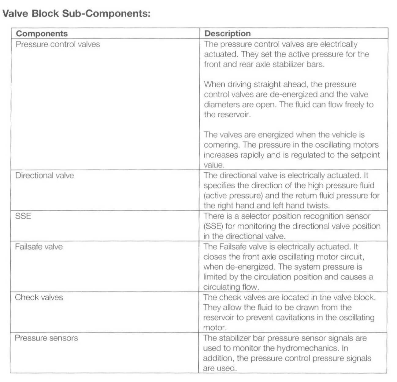 Valve Block: The valve block is an electrically controlled hydraulic distribution assembly and is located behind the right front wheel housing panel (at the base of the A-pillar).