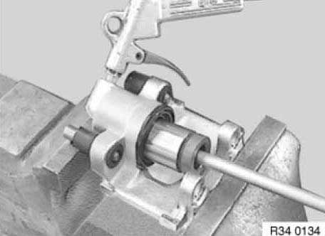 Blow up sleeve with compressed air (maximum 3 bar). Sleeve jumps over brake piston.