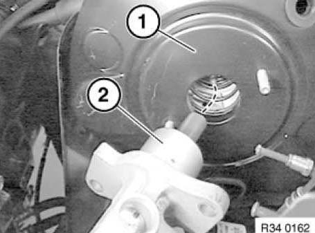 Important! Brake booster (1) must be loosely screwed into place so as not to jam brake master cylinder (2) during installation.
