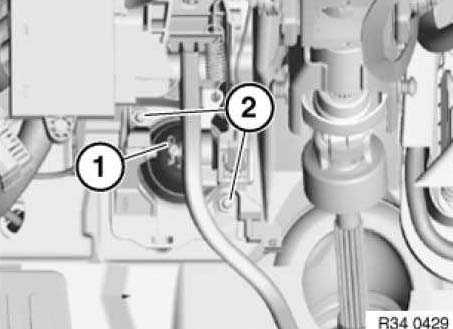 Detach locking clip (1) from brake pedal, disengage and pull out locking pin.