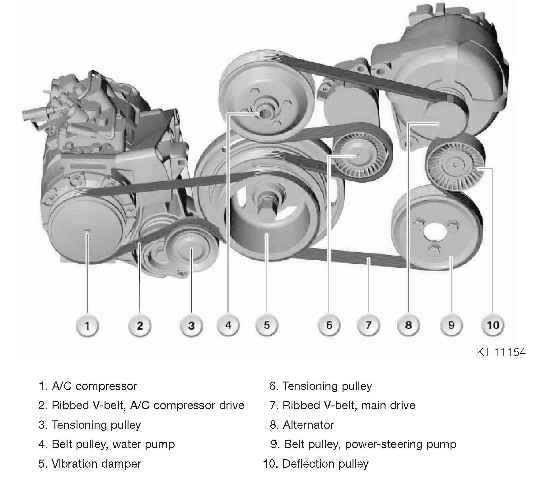 The alternator is fitted with a deflection pulley. The width of the ribbed V-Belt for the A/C compressor drive has been reduced from 5 to 4 ribs.