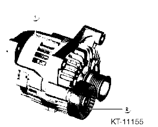 A Bosch alternator (1) with a charging current of 140 A is used on the M54. Due to the high alternator output, the alternator is fitted with a deflection pulley (2) for the ribbed V-Belt.
