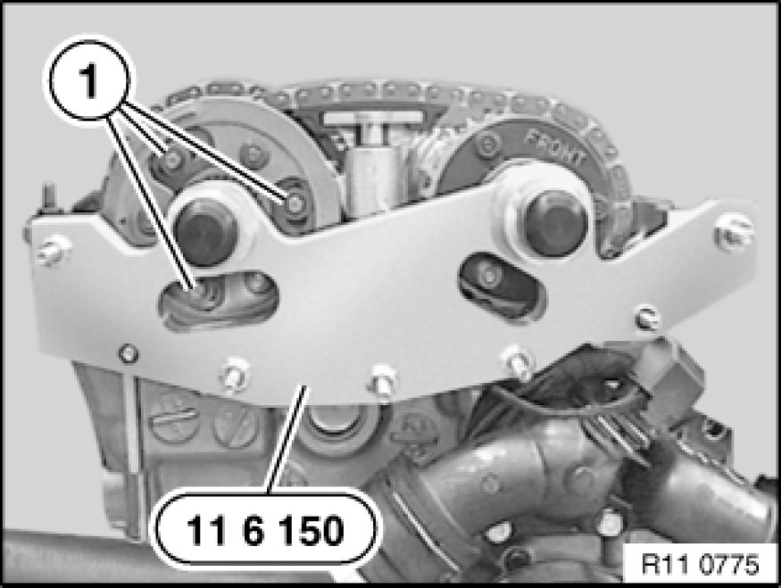 If special tool 11 2 300 11 2 300 Plug Mandrel is secured in the correct bore (1), the engine can no longer be cranked at the central bolt.