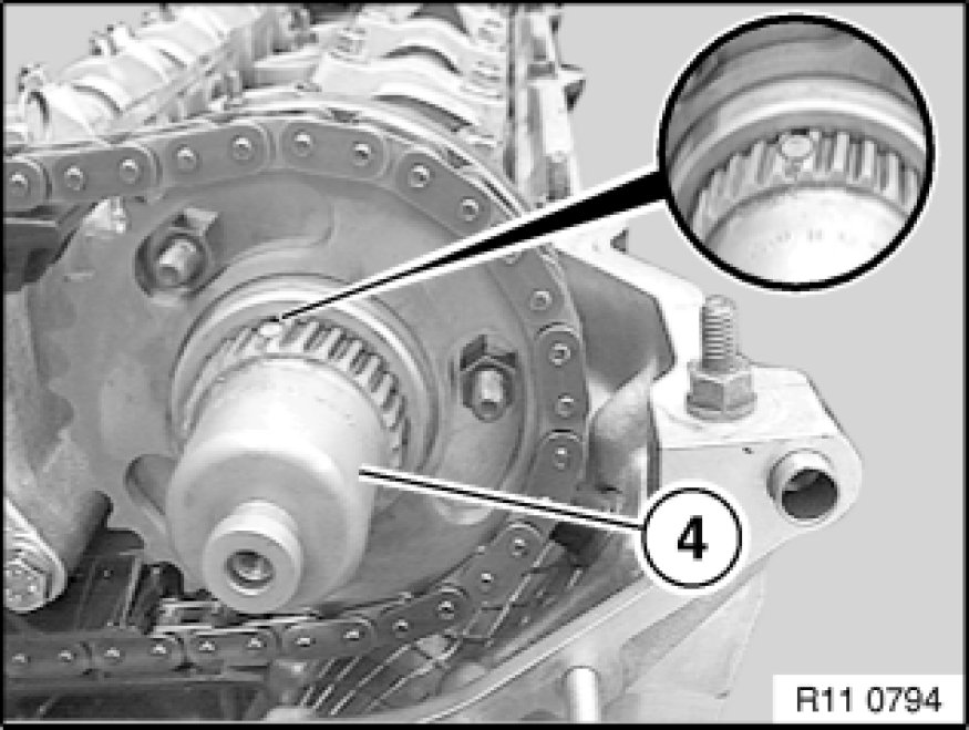 Insert pin of toothed shaft (4) into tooth gaps of splines on camshaft and chain wheel.