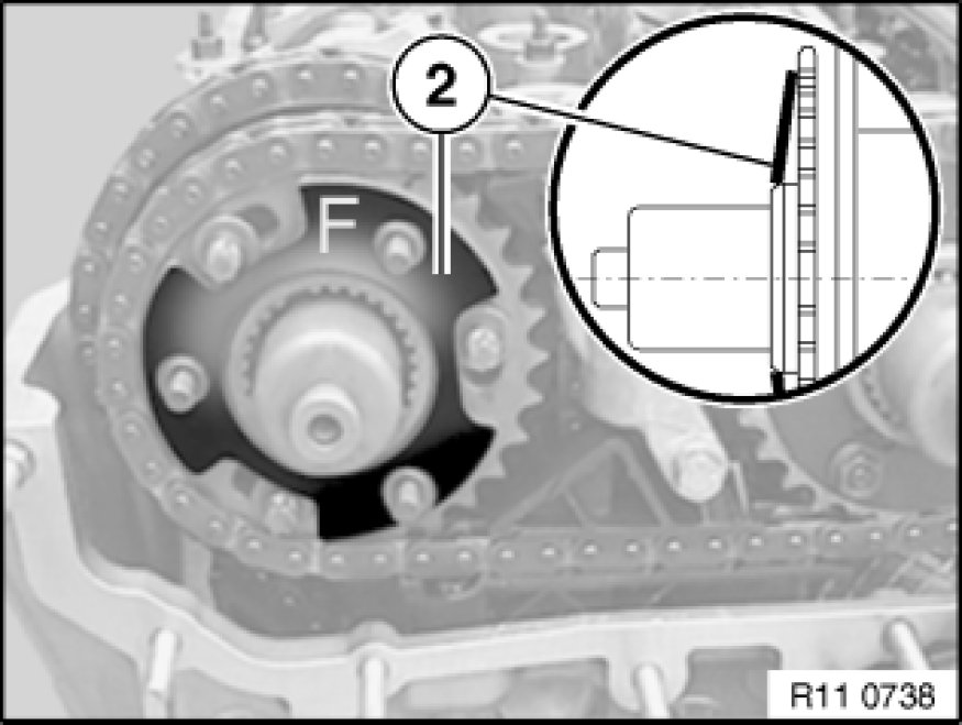 Place chain wheels in special tool 11 6 180 11 6 180 Fixture, position tooth gap on inlet chain wheel as shown in illustration and feed on chain.