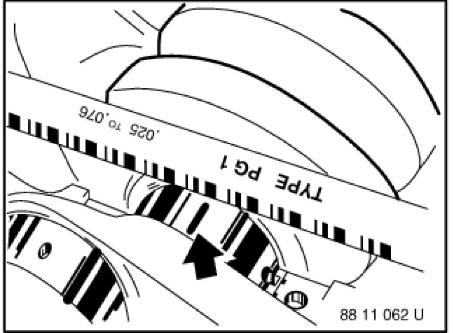 Remove main bearing cap and read off bearing clearance at width of pinched plastic thread on measuring scale.