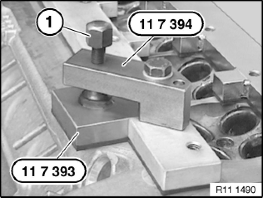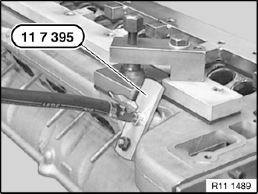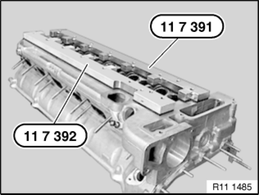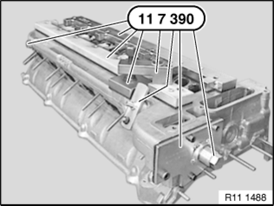 Place special tools 11 7 391 11 7 390 Complete Pressure Testing Fixture / 11 7 392 11 7 390 Complete Pressure Testing Fixture on cylinder head sealing surface and screw down with cylinder head bolts.