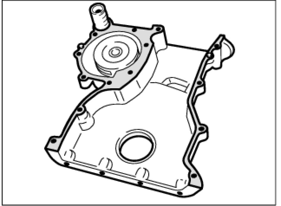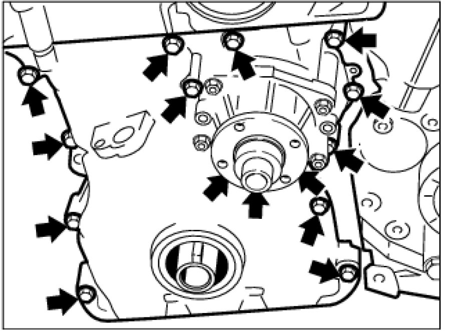 - Thinly and evenly to the entire sealing face of the timing case cover to the cylinder head gasket.
