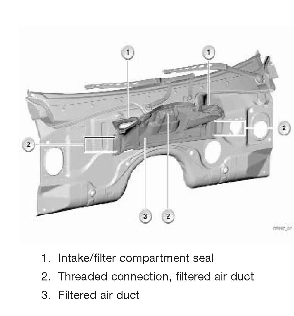 In the same way as for the seals, particular care must be taken when installing the filtered air duct and the filter compartment covers. Secondary (unfiltered) air may be drawn in from the engine compartment if the seal between the duct components is defective.