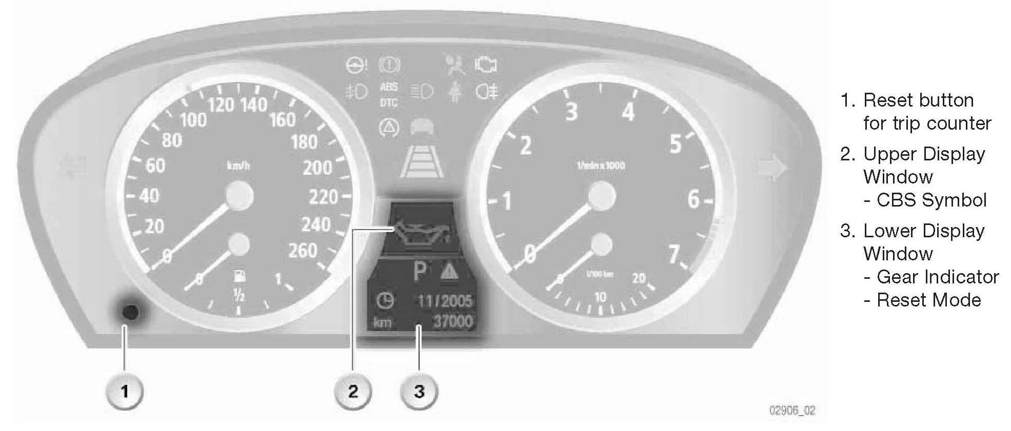 In the upper display window, the CBS symbol, e.g. for engine oil service overdue will be displayed. Press the reset button until the time/distance-dependent displays in the lower display window are replaced with dashes. Reset is no longer possible once more than 80 percent of the interval has expired. A reset lock will be shown in the display with "OK".