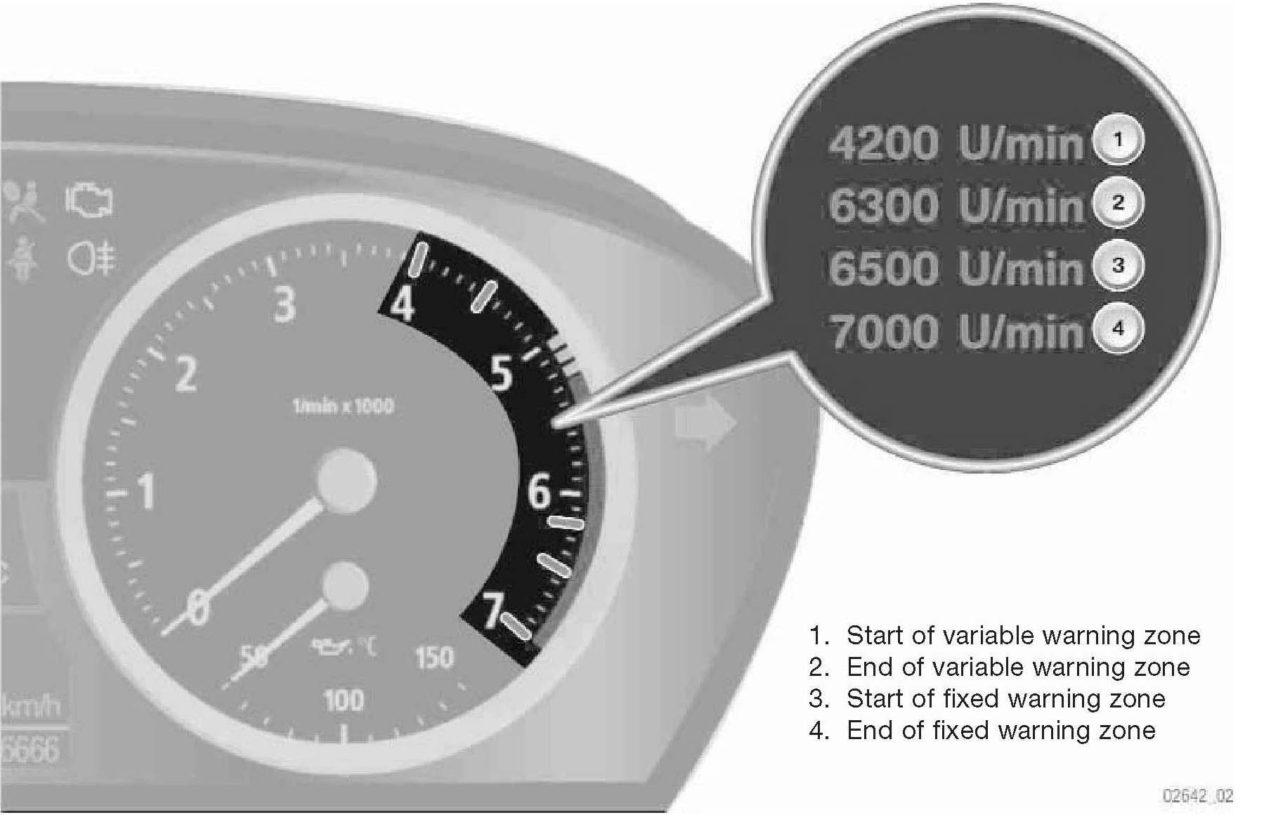 The maximum engine speed warning display is indicated by the tech as a function of engine temperature.