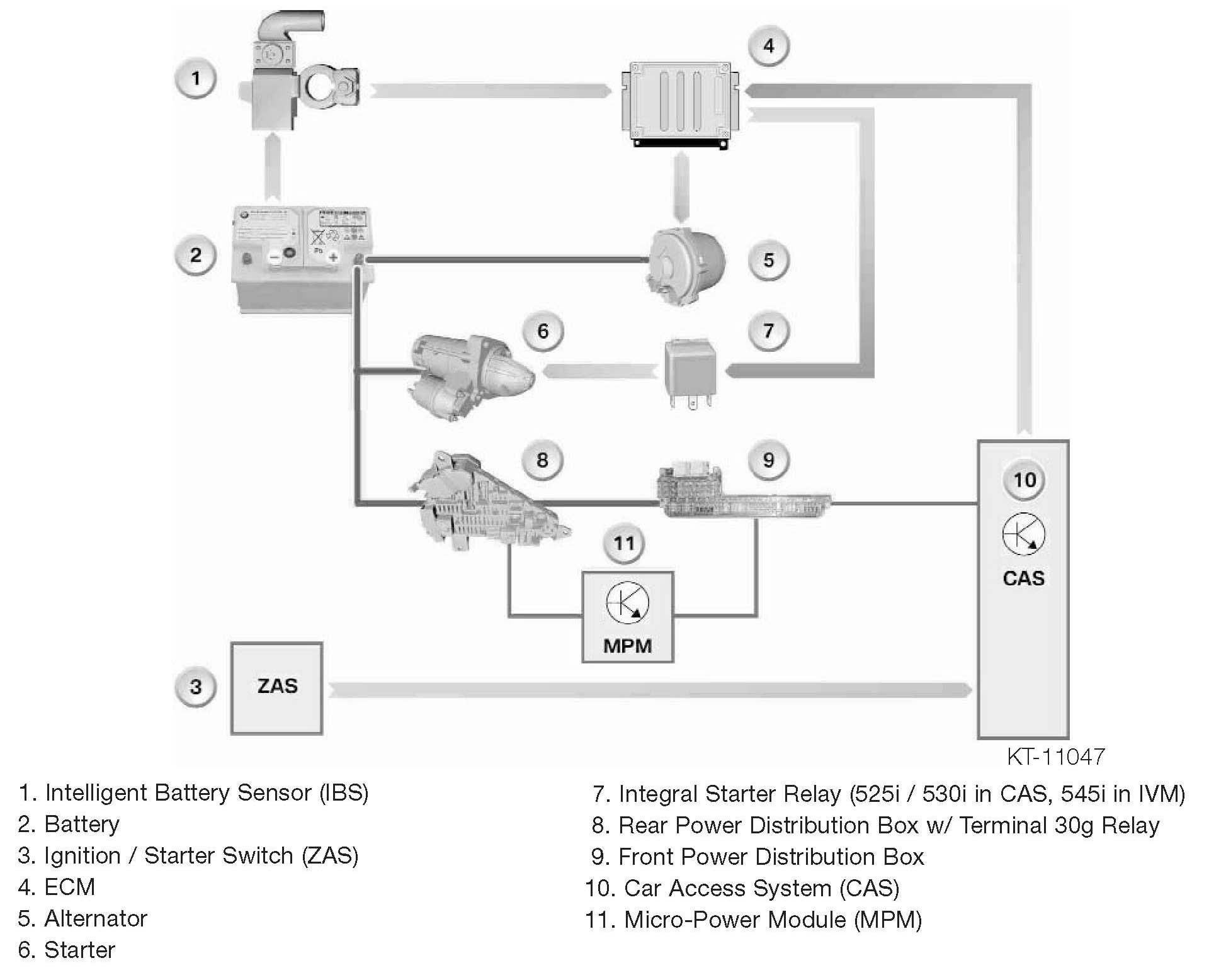 A lead is installed between the ECM and the CAS for vehicles with automatic or SMG transmissions and the comfort starting function. The CAS contains the function of the electronic immobilizer (EWS as in the E65) and the starter relay.
