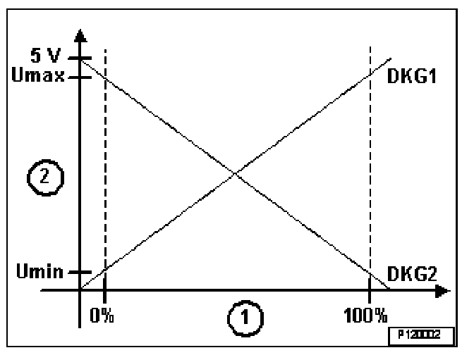 Two potentiometers register the current position of the throttle valve. The engine management controls the position by means of the electric drive until the current valve opening corresponds to the set position. Two potentiometers are used for safety reasons. The characteristic curves of the two potentiometers are contra-rotating. The engine control module powers both potentiometers with an exact voltage of 5 V. This voltage source is also used to supply sensor 1 of the pedal-position sensor or accelerator pedal module.