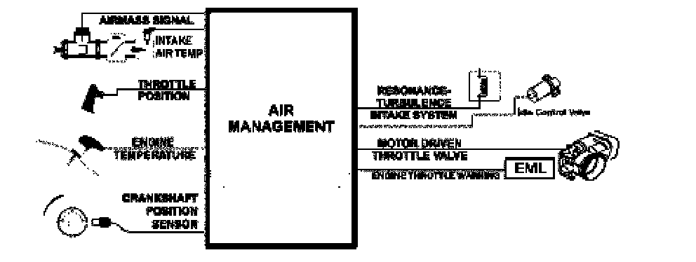 Principle of OperationAir flow into the engine is regulated by the Throttle Valve and/or the Idle Air Actuator. Both of these air "passages" are necessary for smooth engine operation from idle to full load. On the MS45 system, the Throttle Valve and the Idle Air Actuator are electrically controlled. All of the ECM monitoring, processing and output functions are a result of regulated air flow.