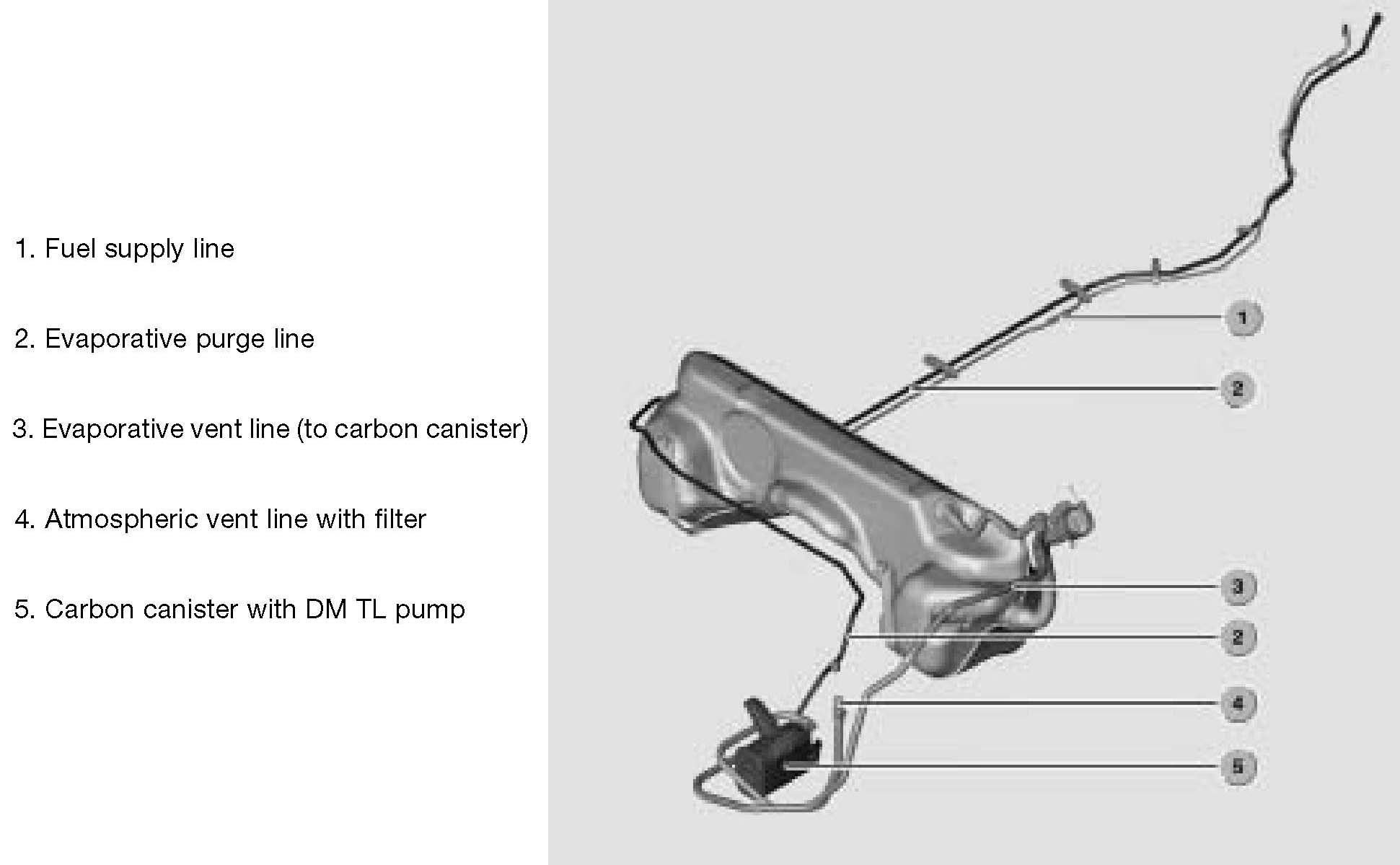 Carbon Canister: As the hydrocarbon vapors enter the canister, they will be absorbed by the active carbon. The remaining air will be vented to the atmosphere through the end of the canister, DM TL and filter, allowing the fuel tank to breath.