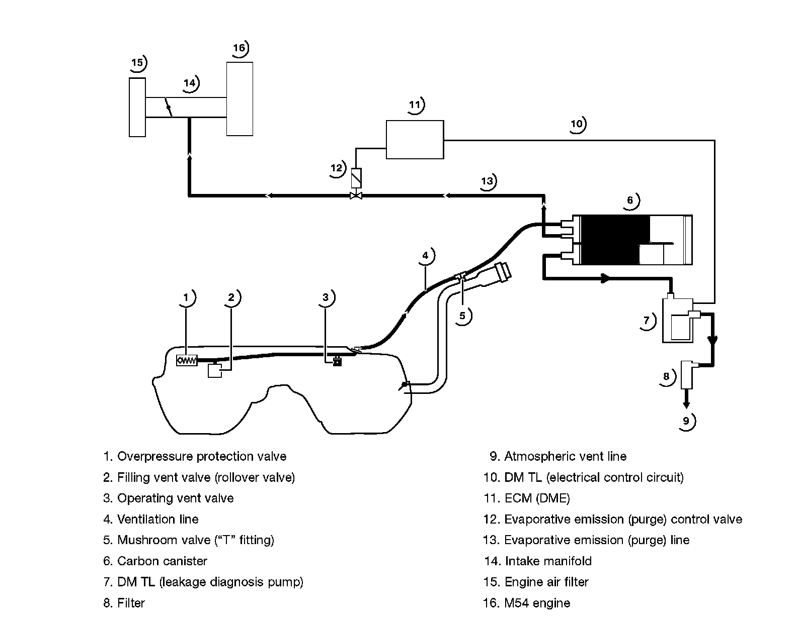 When refueling an ORVR equipped vehicle, the pressure of the fuel entering the tank forces the hydrocarbon vapors through the Filling Vent Valve (2) and the large tank ventilation line (4) into the Carbon Canister (6). The HC is stored in the Carbon Canister and the system can then "breath" through the DM TL (7) and the filter (8).