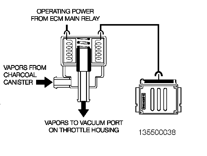 Evaporative Emission Valve: This ECM controlled solenoid valve regulates the purge flow from the Carbon Canister into the intake manifold. The ECM Relay provides operating voltage, and the ECM controls the valve by regulating the ground circuit. The valve is powered open and closed by an internal spring.