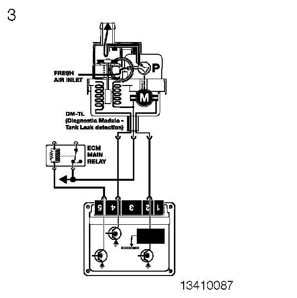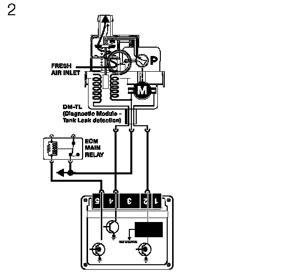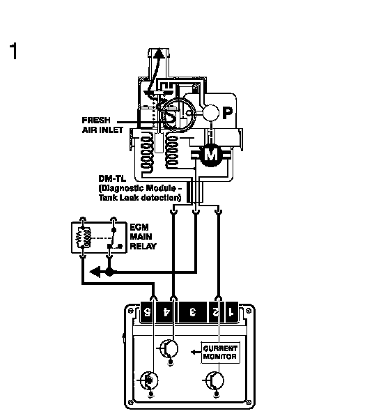 Evaporative Leakage Detection (DM TL): This component ensures accurate fuel system leak detection for leaks as small as 0.5 mm by slightly pressurizing the fuel tank and evaporative components. The DM TL pump contains an integral DC motor which is activated directly by the ECM. The ECM monitors the pump motor operating current as the measurement for detecting leaks.