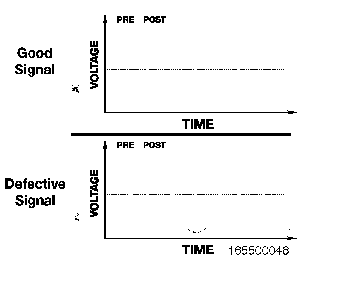 During the evaluation period, the signal of the post cat. sensor must remain within a relatively constant voltage range (700 800 mV). The post cat. O2 voltage remains high with a very slight fluctuation. This indicates a further lack of oxygen when compared to the pre cat. sensor.