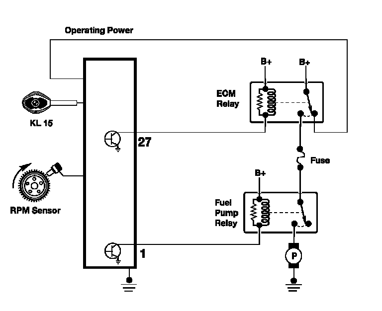 If the engine RPM signal is not present, the ECM will deactivate the Fuel Pump Relay.