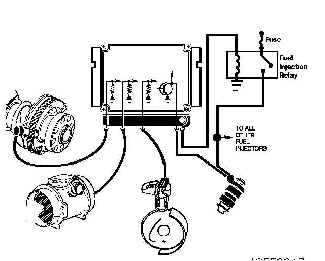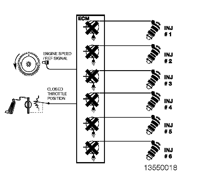 The ECM has six Final Stage output transistors that switch ground to the six injector solenoids. The Injector triggering is first established from the Crankshaft Position/RPM Sensor.